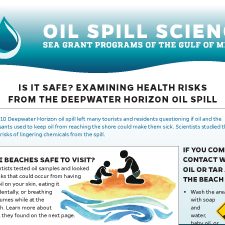 The Gulf of Mexico Research Initiative (GoMRI) is pleased to announce a new Sea Grant publication that addresses the public’s questions about health safety after the Deepwater Horizon incident. The fact sheet, Is it Safe? Examining Health Risks from the Deepwater Horizon Oil Spill succinctly explains findings from peer-reviewed studies and reports from state and federal agencies that investigated the safety of the beach, water, and seafood since the spill.